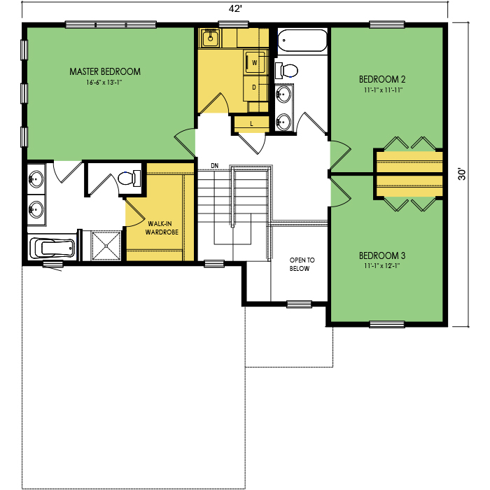 A part of our dream series, the tamarack floor plan features 3 bedrooms and 1.5 bathrooms with a foot print of 44x30 feet and 1342 total square feet of living space.