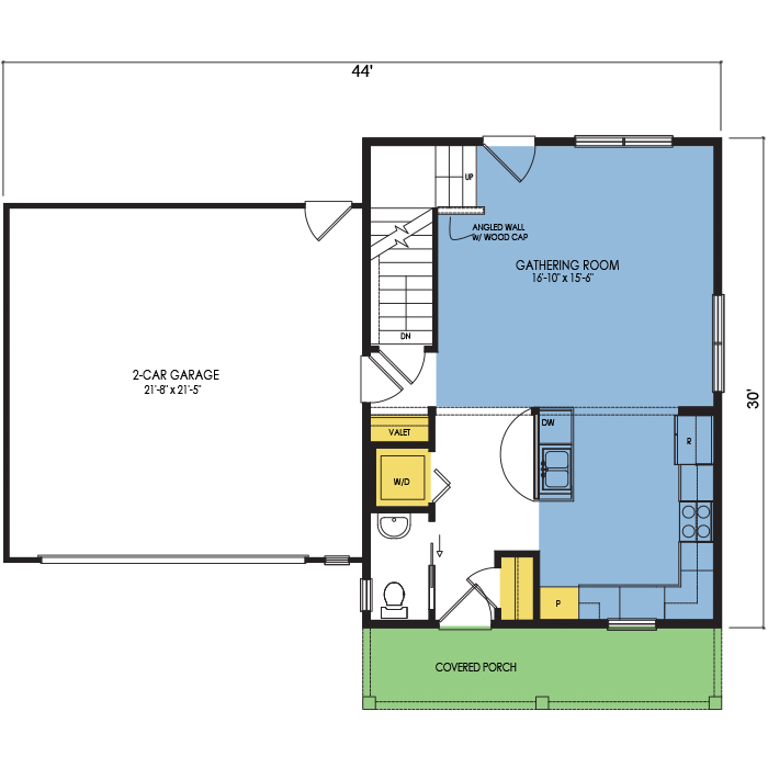 A part of our Dream Series, the Tamarack floor plan features 2 stories, 3 bedrooms, 1.5 bathrooms, a 2 car garage, a footprint of 44x30 feet, and 1342 total square feet of living space. Floor Plan #DR230