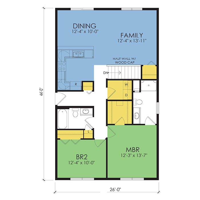 A part of our dream series, the tamarack floor plan features 3 bedrooms and 1.5 bathrooms with a foot print of 44x30 feet and 1342 total square feet of living space.