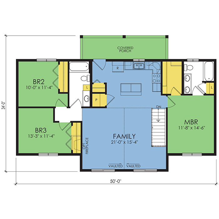 A part of our Wausau Originals, the Conifer floor plan features 3 bedrooms and 2 bathrooms with a foot print of 50x34 feet and 1288 total square feet of living space. Floor Plan #WO612