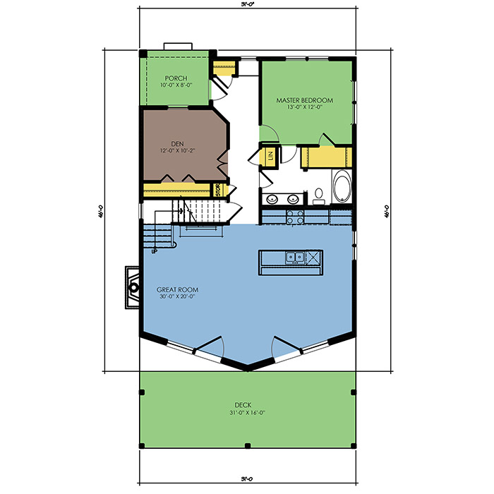 A part of our Vacation Series, the Delevan floor plan features 1 bedroom and 2 bathrooms with a foot print of 31x46 feet and 1565 total square feet of living space. Floor Plan #VL304