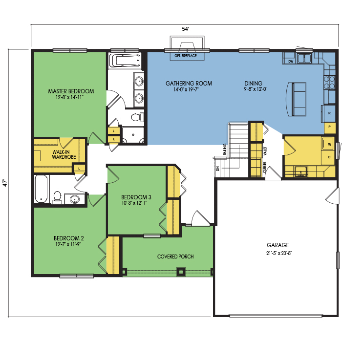A part of our Resort Series, the Robson floor plan features 3 bedrooms and 2 bathrooms with a foot print of 54x47 feet and 1668 total square feet of living space. Floor Plan #RN129