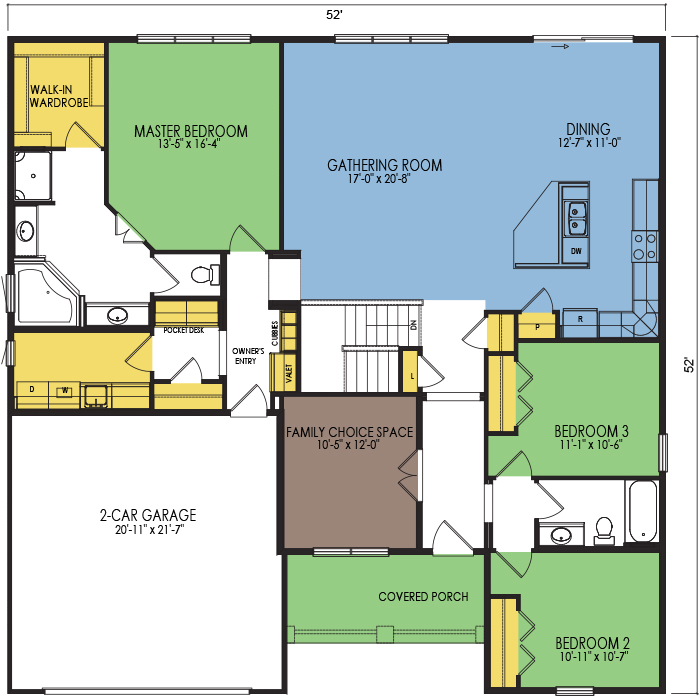 A part of our Family Series, the Teton floor plan features 3 bedrooms and 2 bathrooms with a footprint of 52x52 feet and 2055 total square feet of living space. Floor Plan #FM122